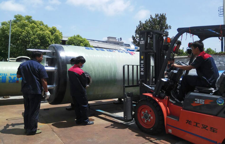 上海一體化泵站廠家弘泱科技的小伙伴們,在吊裝前已經準備就緒,他們或開叉車、或指導搬運、或準備筒體下面防治的沙袋等。